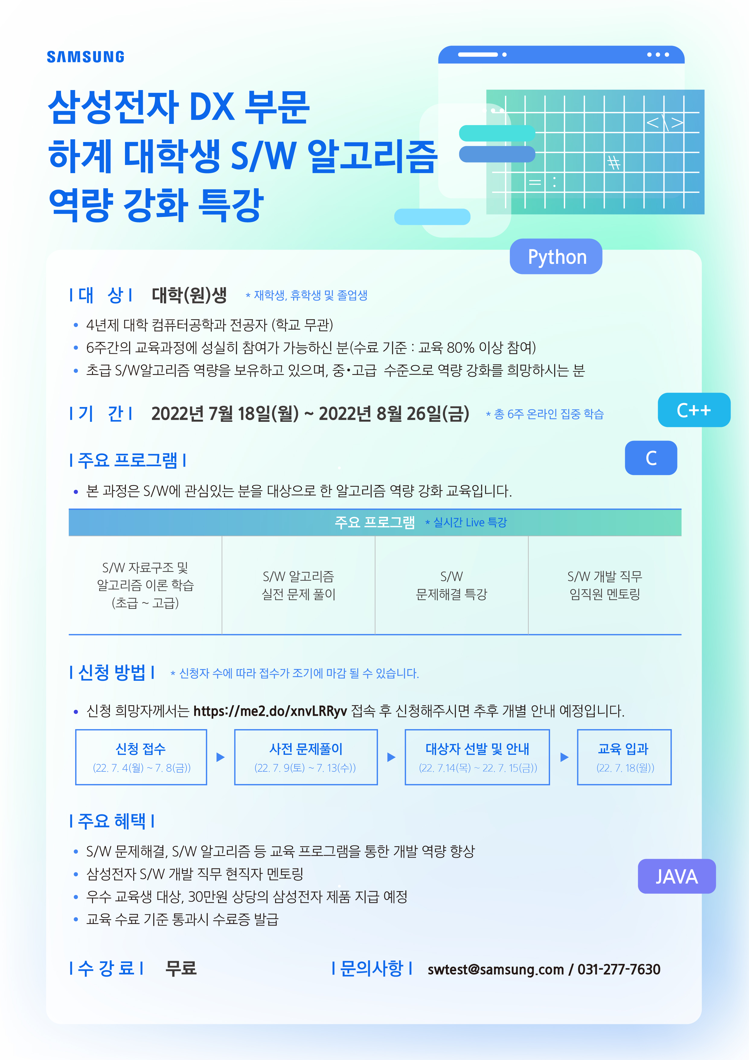 [일상] 2022 삼성전자 DX부문 하계 대학생 S/W 알고리즘 역량 강화 특강 후기 (0) | 2022.09.18 |